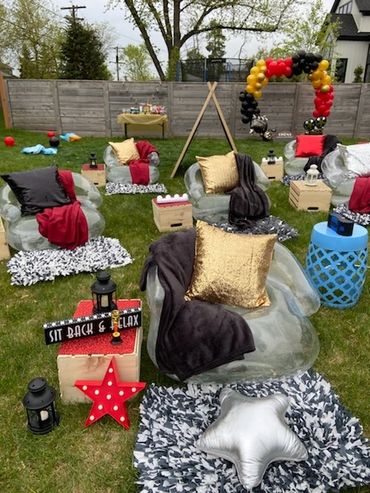 Enjoy a movie or gamer night in the comfort of your home or under the stars! Pick from any of our themes! This rental includes a blow up loveseat for two, two throw pillows, two blankets, rug, crates, lanterns, chalk boards and balloons scattered! Please call to inquire for details! Price is marked per set up. Set up could be for two people.