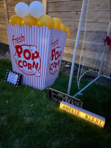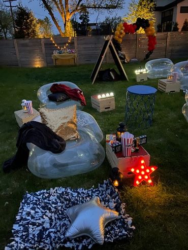 You can enjoy a movie night inside or outside on a beautiful summer night! Kim and Co, can provide an awesome rental for a socially distanced get together! Pick from Best part is every guest can keep the blow up chair as a favor! The rental comes with the throw blanket, pillow, rug, crate, lantern, chalk board and balloons scattered. If your event is outside the balloons may or may not work but we also bring some extra string lights to make each event its own! Please call to inquire on pricing!