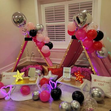 You can enjoy a gamer night inside or outside on a beautiful summer night! Kim and Co, can provide an awesome rental for the kids that love gaming! Tbest part is every guest can keep the blow up chair as a favor! The rental comes with the throw blanket, pillow, rug, crate, lantern, chalk board and balloons scattered. If your event is outside the balloons may or may not work but we also bring some extra string lights to make each event its own! Please call to inquire as every party is a bit diffe