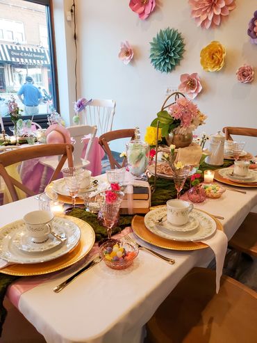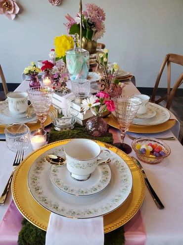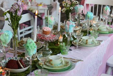 Who doesn't LOVE a tea party??? Birthday parties, Showers, Luncheons, Brunch, Weddings or just because! We offer the most beautiful table displays! From elegant dinner parties to a Childs first tea we do it all! From a traditional English Tea, Frozen Tea Party we can really customize this beauty! Every party is a bit different. Please feel free to inquire for pricing. We can tell you each place setting starts around $25 and that includes table linen, cloth napkins, table runner, candy for the dishes, flowers for the table, and cotton candy for the glassware! It truly is a beautiful display! Check out our pictures and see for yourself!